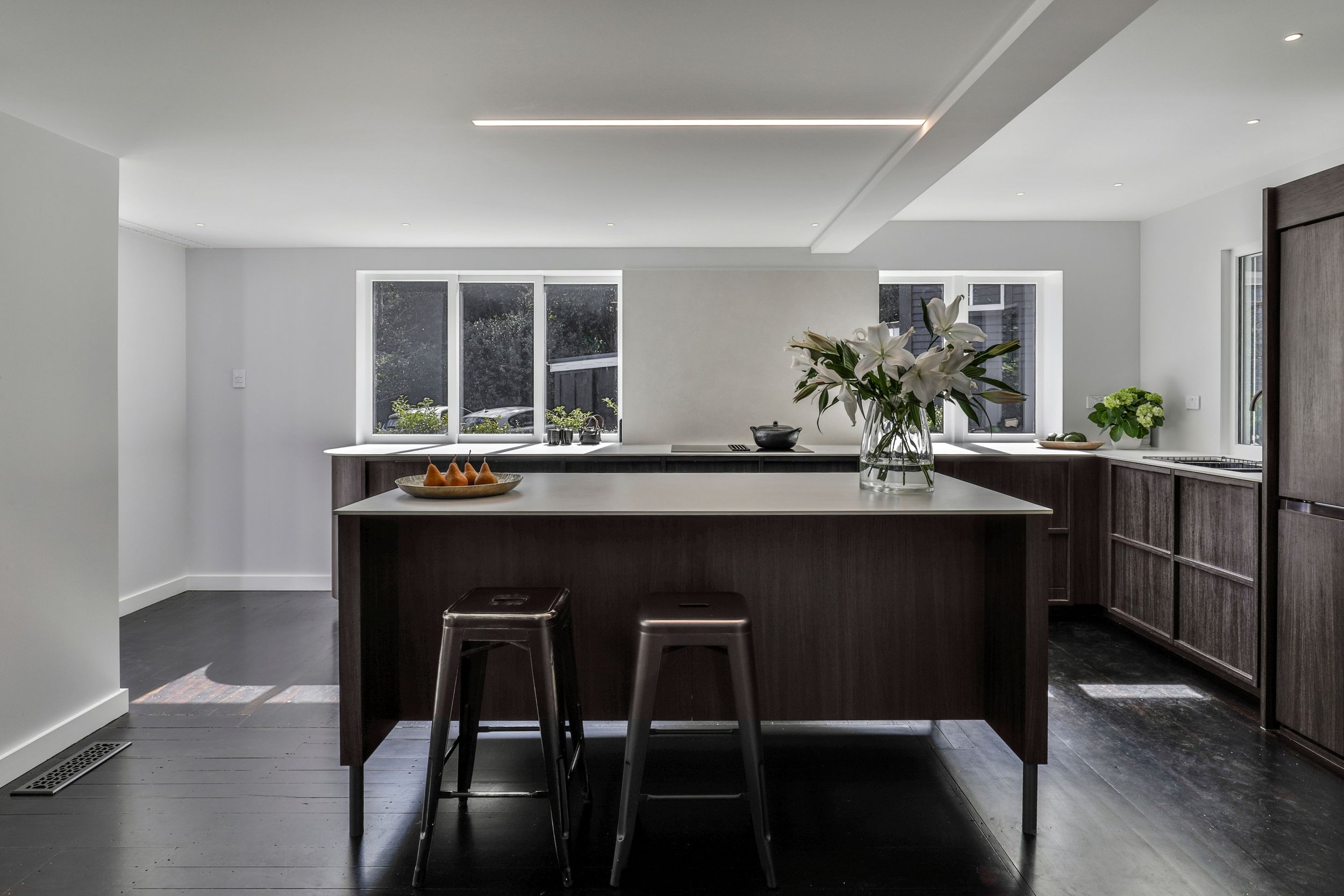 Dekton Zenith 12mm and Laminam Luna White 12mm benchtops, Melteca Melamine Blackened Legno and Laminex Melamine White cabinetry, Archant Back and Edge Straight Brushed Anthracite handles